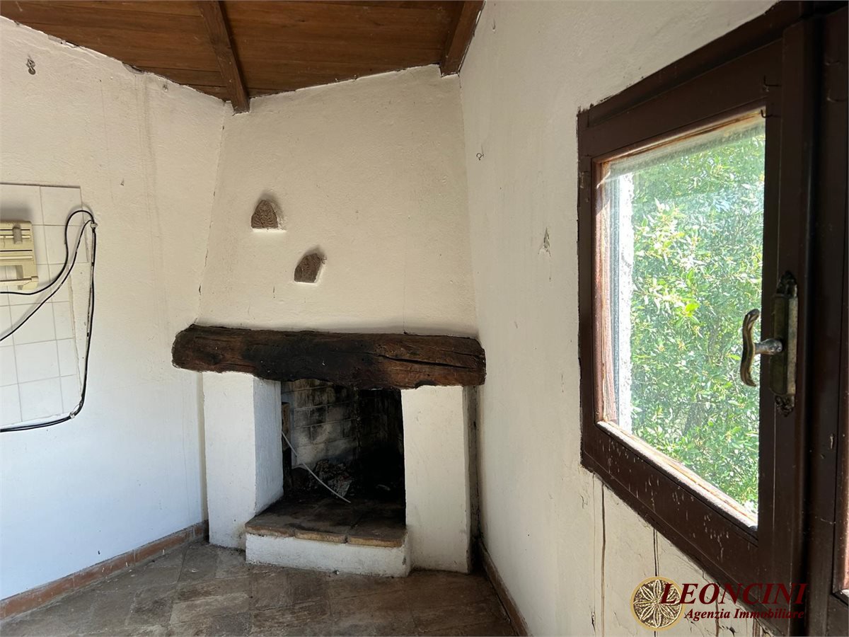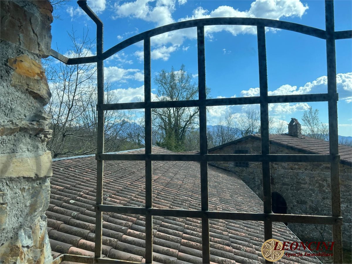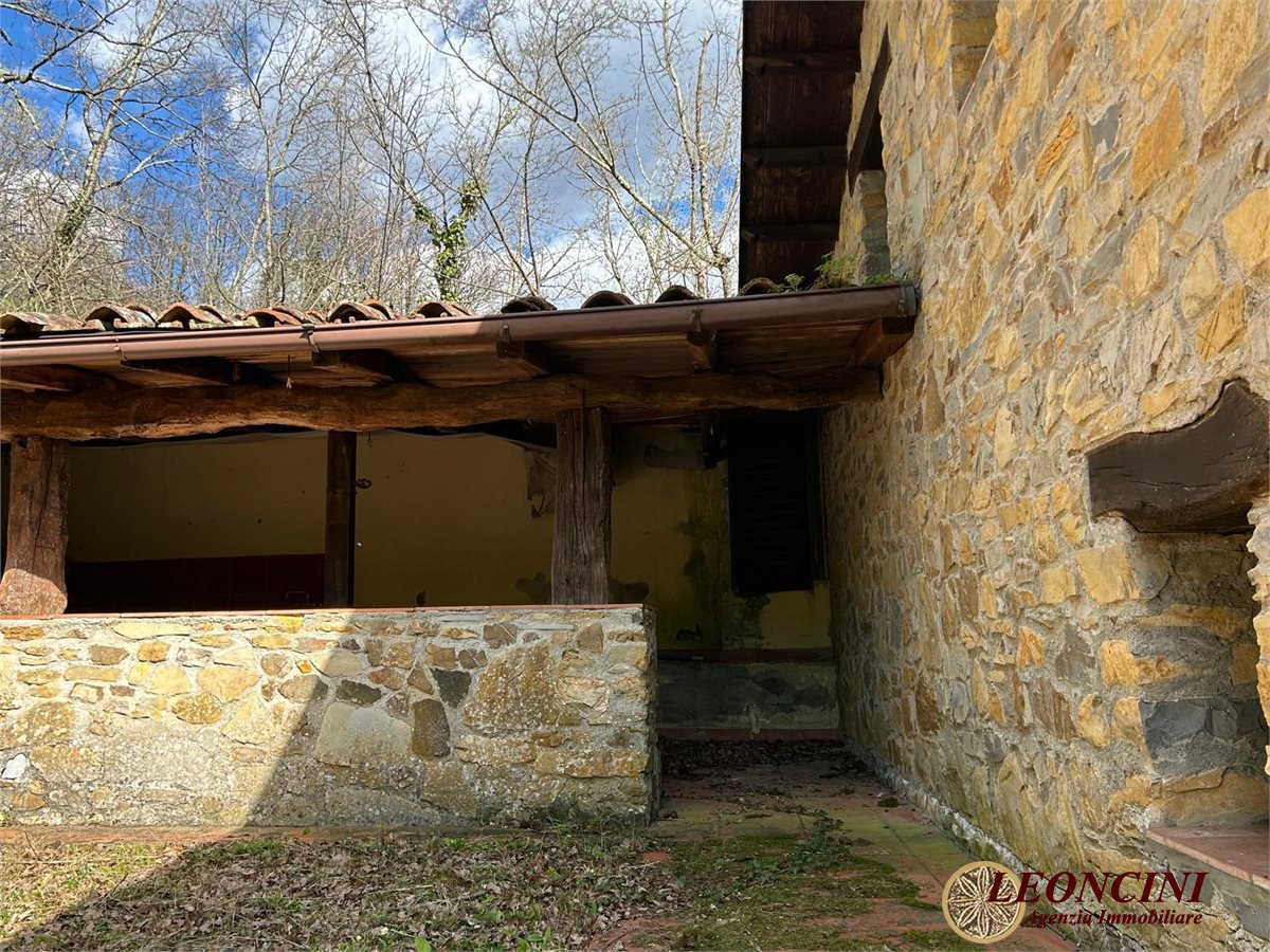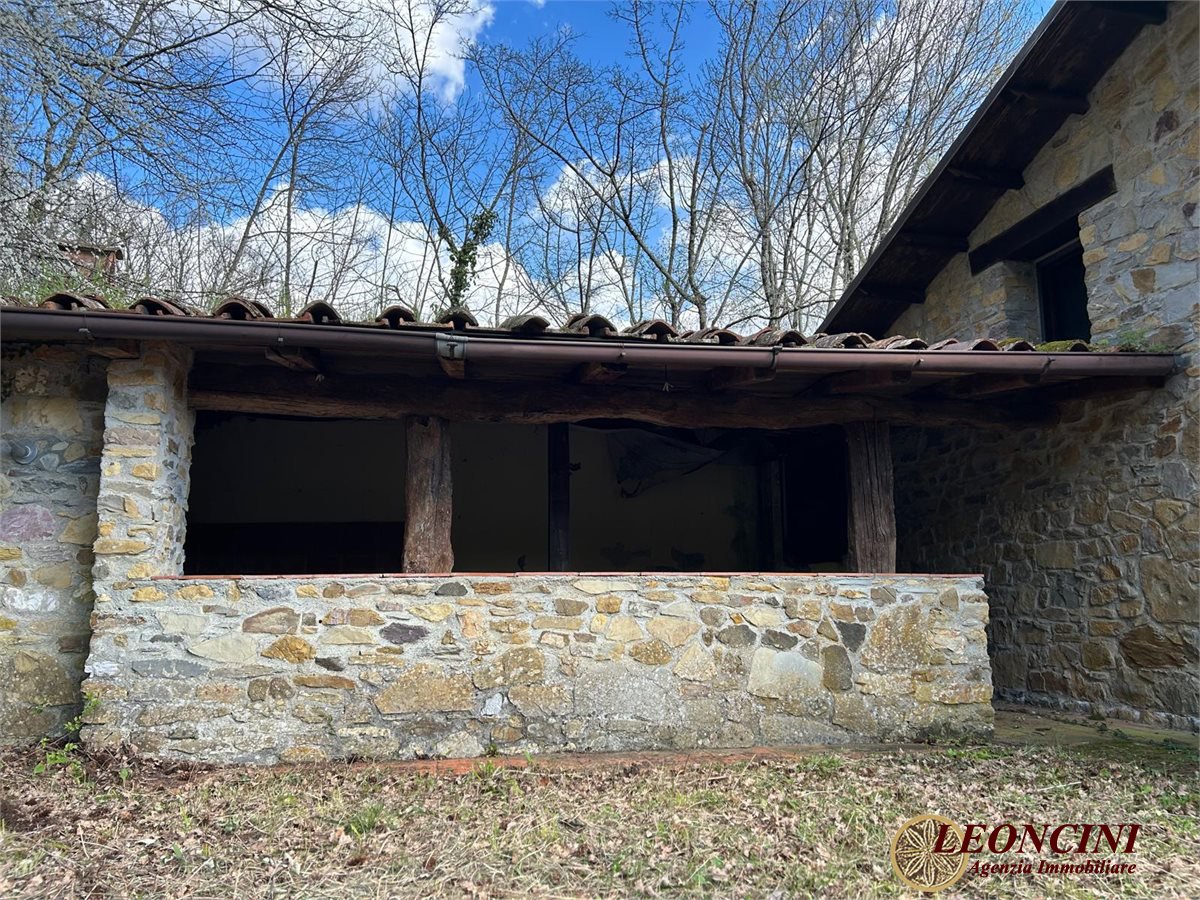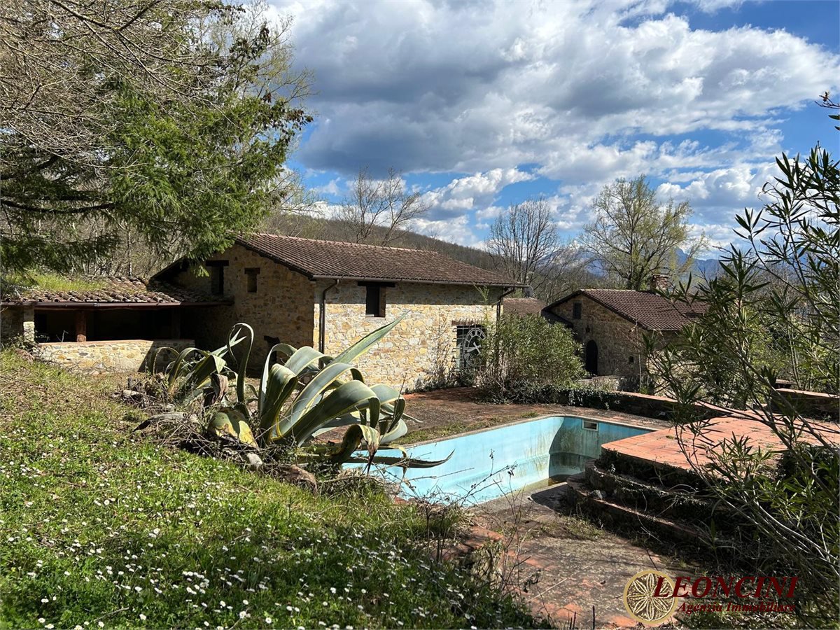 Fivizzano, loc. Agnino, is offering a rustic farmhouse for sale. The building is a rural stone complex, composed of several interconnected structures, with tiled roofs and stone walls. The architecture recalls a traditional rustic style, typical of a country farmhouse or an old mill. The windows and doors integrate with the original design; part of the building, built as an extension, features glass surfaces with iron grilles. The building is surrounded by a large outdoor area featuring a green lawn with deciduous trees. To the north extends a wooded hill with mixed vegetation in a natural and picturesque setting. Externally, adjoining the north façade of the building, on the raised ground floor, is a rustic covered area (like a canopy) with an outdoor kitchen and a barbecue area. The architecture is simple and functional, with exposed masonry and stone walls, a built-in fireplace, and a masonry sink covered with ochre-colored tiles. The ceiling is supported by solid wood beams and a central wooden pillar, while the terracotta floor is typical of traditional rural homes.